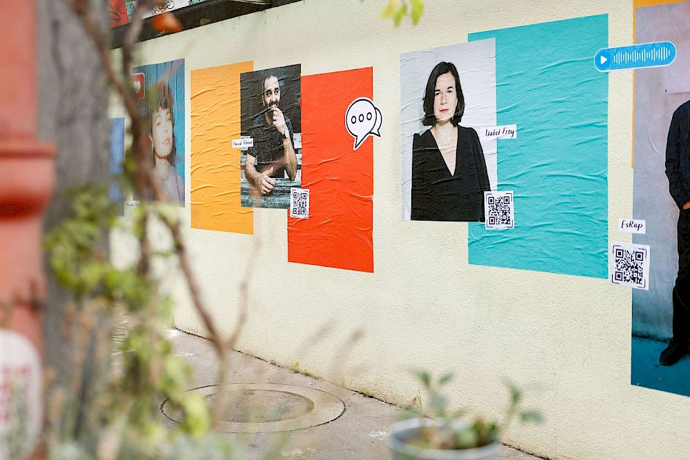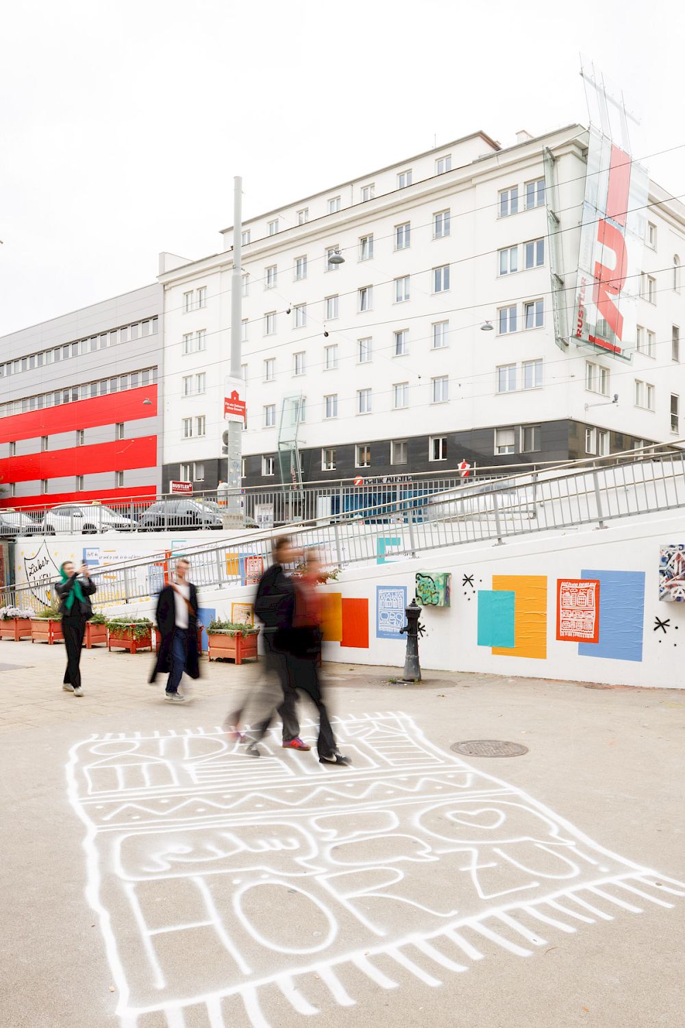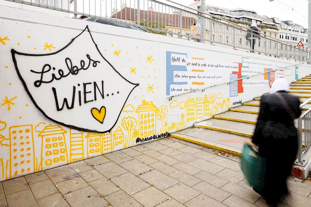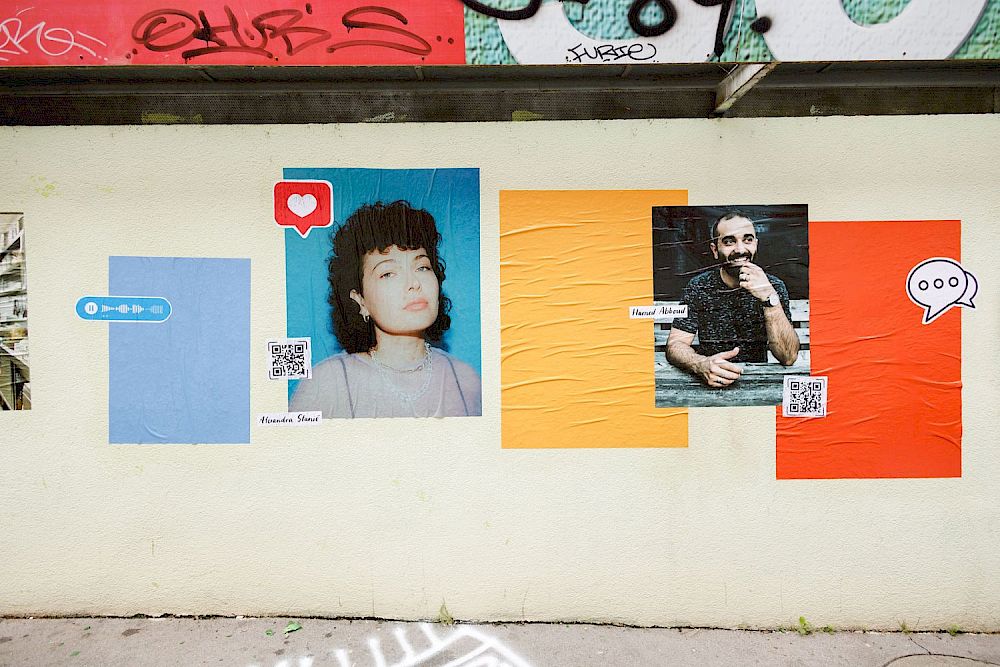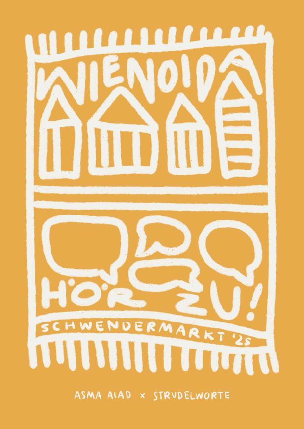 Die Künstlerin, Kuratorin und Aktivistin Asma Aiad schafft mit ihrem multimedialen Projekt ein vielschichtiges Bild eines „Wir“. An den Wänden des Schwendermarkts zeigt sie großformatige Porträts von Menschen, die in Wien leben und den Alltag dieser Stadt prägen, aber oft wenig Sichtbarkeit erhalten. Über QR-Codes können Sprachnachrichten der abgebildeten Personen abgerufen werden, die einen neuen Blick auf sie geben und vorgefertigte Rollenbilder in Frage stellen. Am Weg zwischen den Wänden hat Esma Bošnjaković aka Strudelworte zwei Teppiche mit Mustern aus handgeschriebenen Botschaften aufgesprayt.