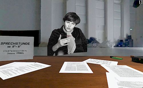 Auf die sogenannte gläserne Decke, an die viele Frauen im Zuge ihrer Berufskarriere irgendwann stoßen, bezieht sich Eni Brandner in „Substanzielle Quantensprünge“. Ihr AR-Objekt gestaltet diese unsichtbare Barriere und vereint sie mit scharfzüngigen Statements Johanna Dohnals. Wie deren Arbeit das Leben von Frauen – direkt oder im übertragenen Sinn – berührt hat, zeigen die fiktiven „Porträts of Progress“, die Kris Hofmann entwickelt hat. Susi Jirkuff hingegen setzt in „Sprechstunde“ die Politikerin selbst in Szene und hat dazu Archivfotos von Dohnal, die sie gestikulierend am Schreibtisch zeigen, animiert. Kleidungsstücke spielen in Nayeun Parks Auseinandersetzung „Eine protestierende Vase II“ mit Geschlechterrollen, Konzepte von Weiblichkeit und Gewalt gegen Frauen eine wichtige Rolle. Ein Zitat Dohnals, das die „menschliche Zukunft“ als Ziel des Feminismus benennt, war für Veronika Schuberts Auseinandersetzung „Grundsätze“ wesentlich: Ihre Collagen von Zeitungsausschnitten spiegeln die öffentliche Wahrnehmung der frauenpolitischen Themen. Anna Vasof blickt in „Johanna Dohnal – Die Programmiererin“ auf die Gesetze, die die Gesellschaft neu programmiert haben und übersetzt dies in ein virtuelles Monument für die berühmte Politikerin.