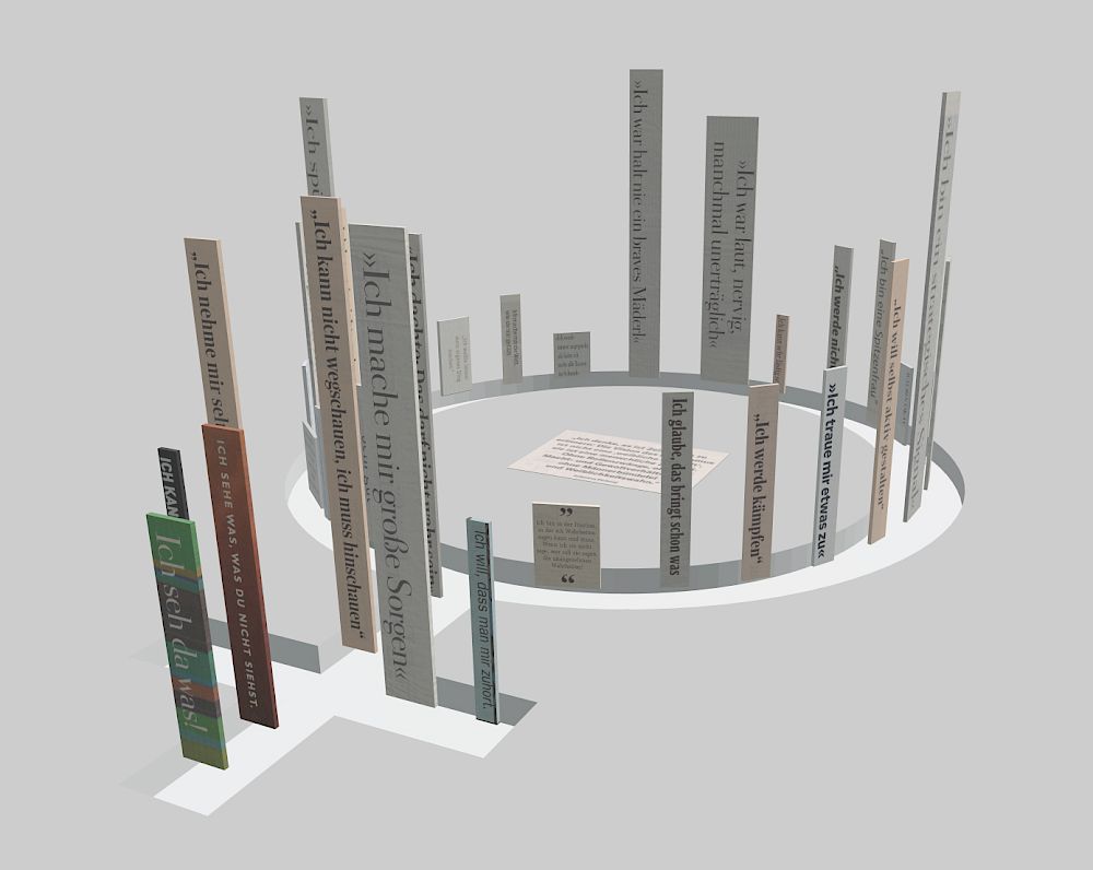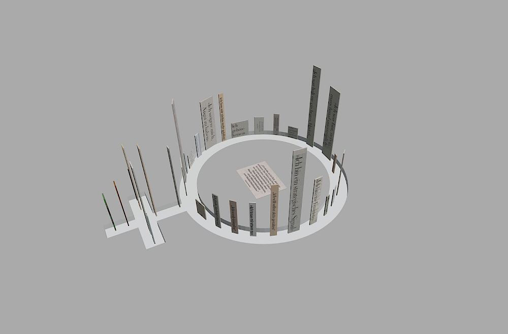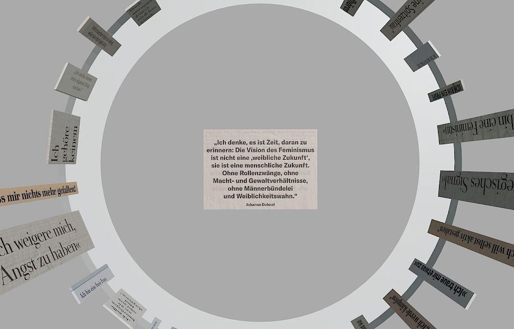 Für diese AR-Installation verwende ich Sätze, die Johanna Dohnal gesagt haben könnte. Zugleich sollen es aber auch Sätze sein, mit denen sich die Betrachter*innen identifizieren können oder die zumindest zum Reflektieren anregen. Alle Sätze beginnen mit „ICH“ und beziehen sich auf Rollenbilder, Selbstwahrnehmung, Fremdwahrnehmung, Erwartungshaltungen, Wünsche, Zuschreibungen und Selbstdefinition.